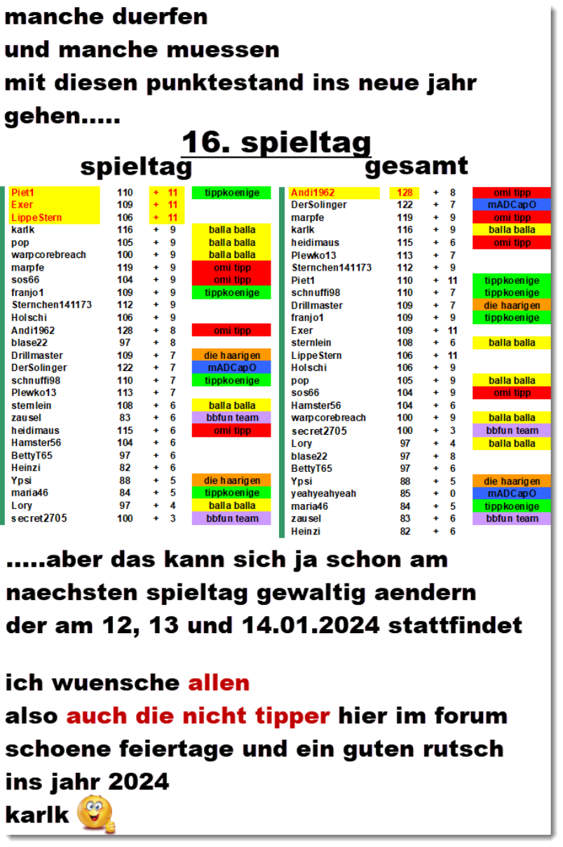 Bitte spar dir sowas. Ich glaube in den letzten Wochen hat das besser als jemals zuvor geklappt. Als ich hier vor Wochen um Unterstützung gebeten habe, haben alle schön den Schwanz eingezogen und sich zurückgehalten. Die Ergebnisse werden mehrfach am WE aktualisiert - händisch. Wenn mal was fehlt, irgendwas nicht passt, dann gib hier Bescheid anstatt nur kopfschüttelnd deinen Unmut kundzutun.